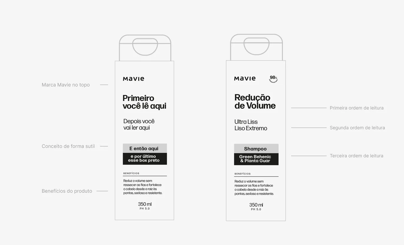 Nesse projeto que criei para a Mavie Cosméticos, trabalhei justamente a hierarquia das informações antes do visual. Como se trata de um segmento com muitos textos, a ordem de leitura seria fundamental para ajudar o consumidor na gôndola.